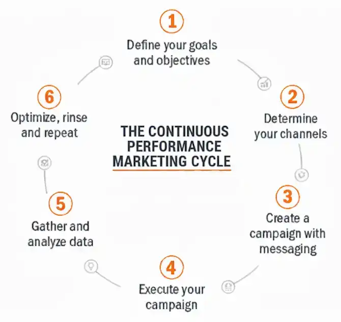This isn’t a one-time project – it’s an agile, ongoing process that ensures your marketing spend consistently delivers measurable results. Here’s how our Continuous Performance Marketing Cycle drives your success: